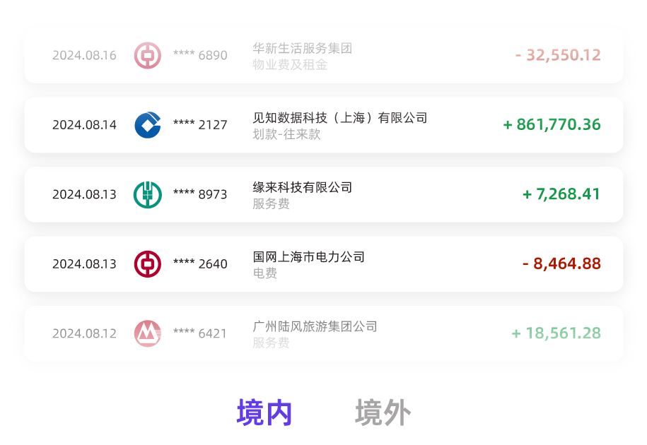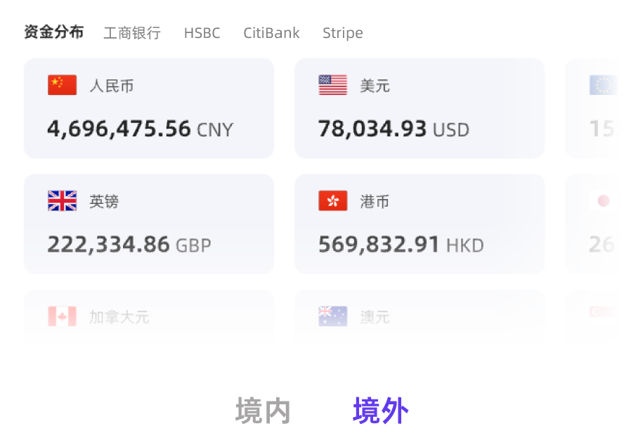 连接境内外主流银行及三方平台。 实现多账户一体化管理。